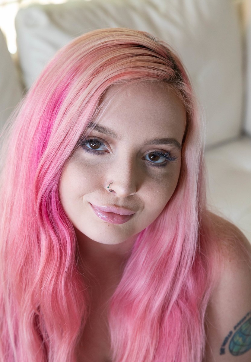Милая девушка с розовыми волосами и пирсингованными сосками ублажает член