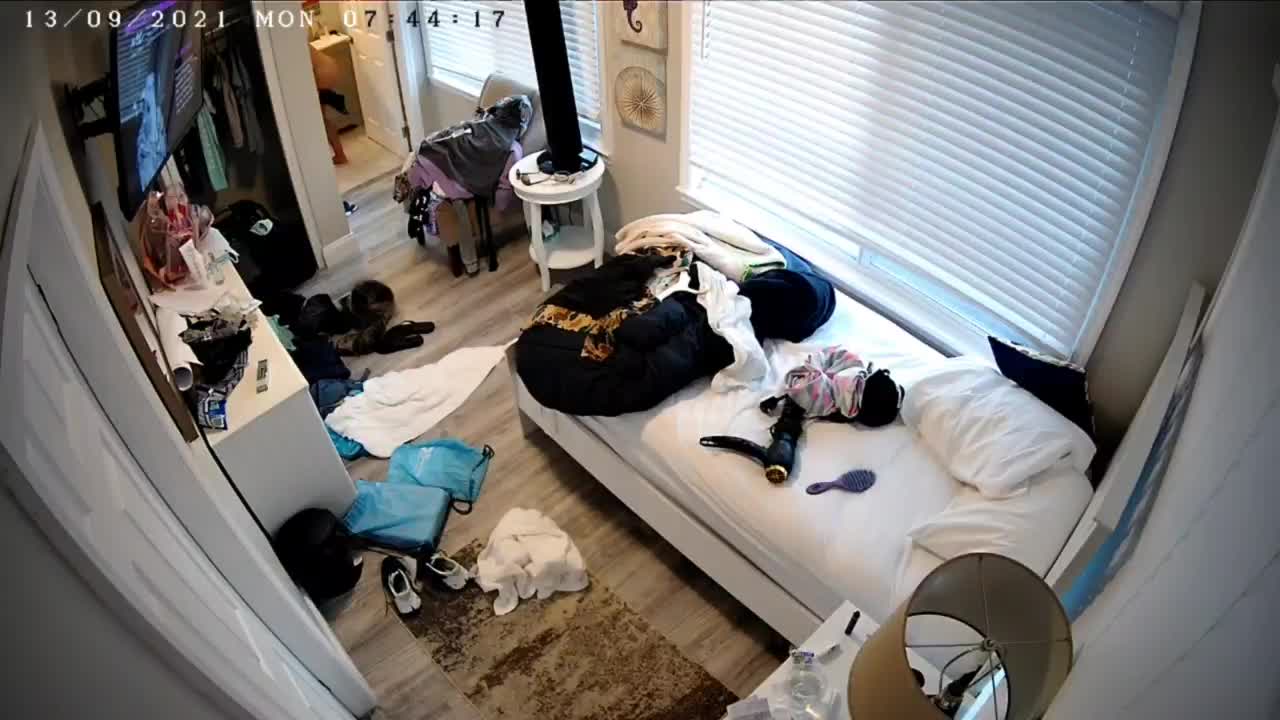 Девушка после принятия душа одевается у себя дома