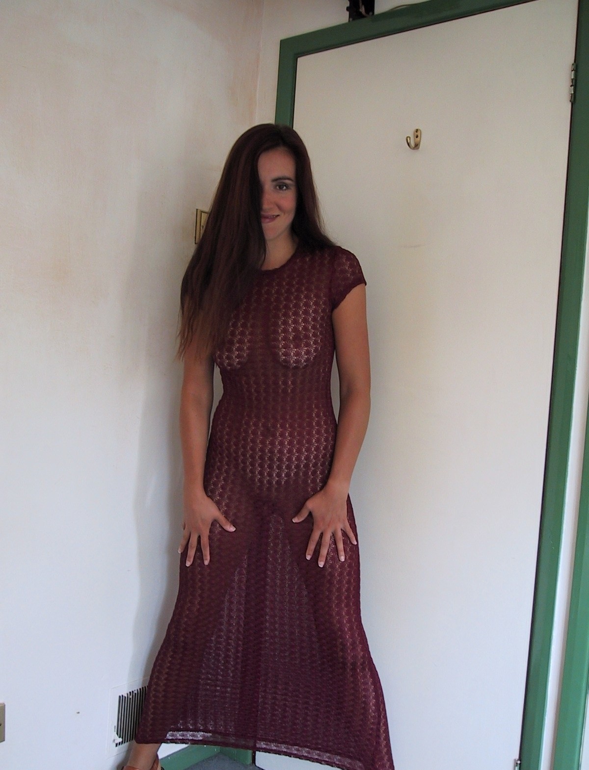 позирует в прозрачно платье периодически поднимая его демонстрируя свои прелести.