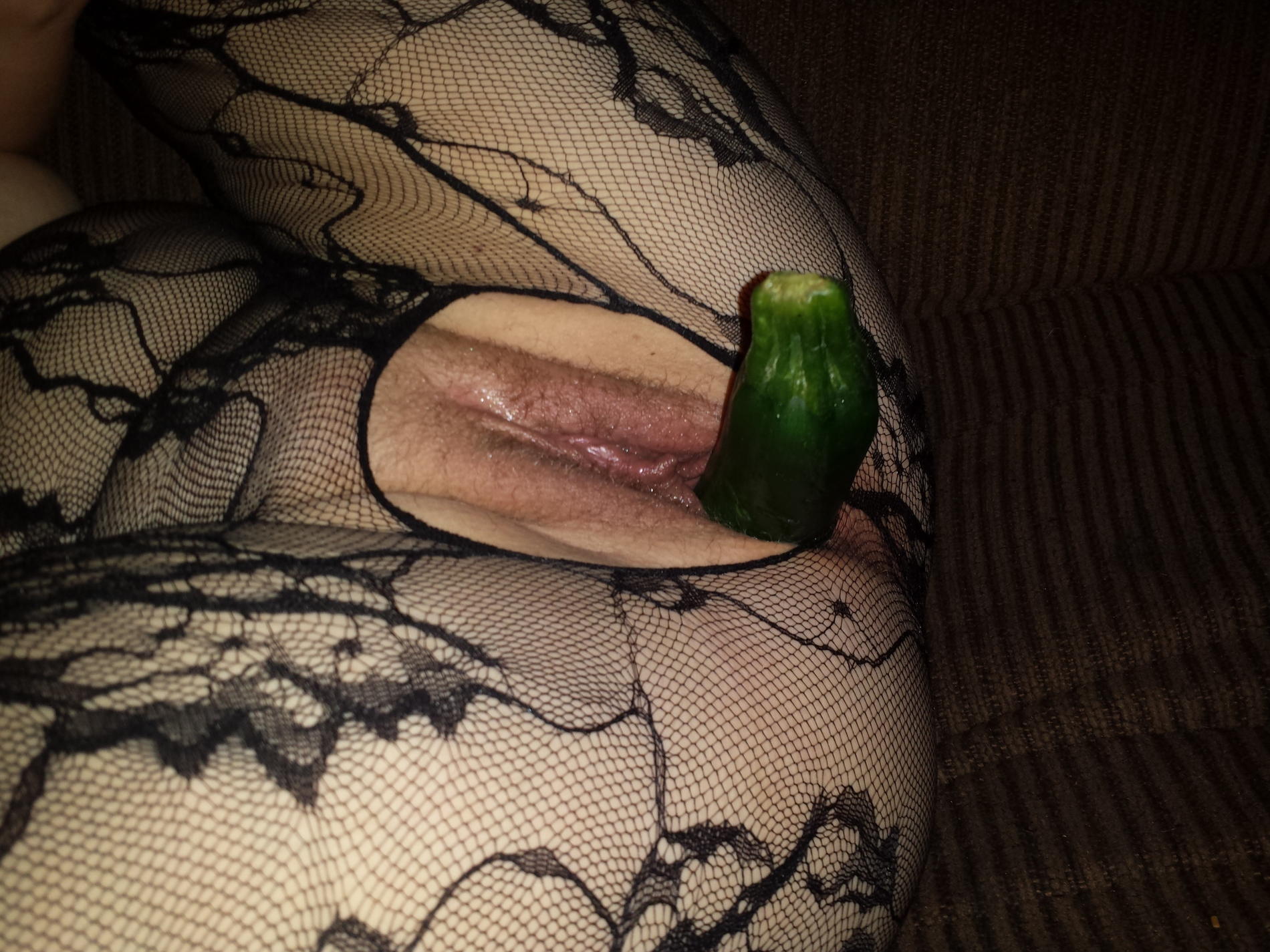 дама в сексуальном прикиде забавляет свою киску огурцом.
