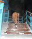В лёгком наряде голубого цвета женщина выскочила на мороз, но потом быстренько побежала в дом к теплу.