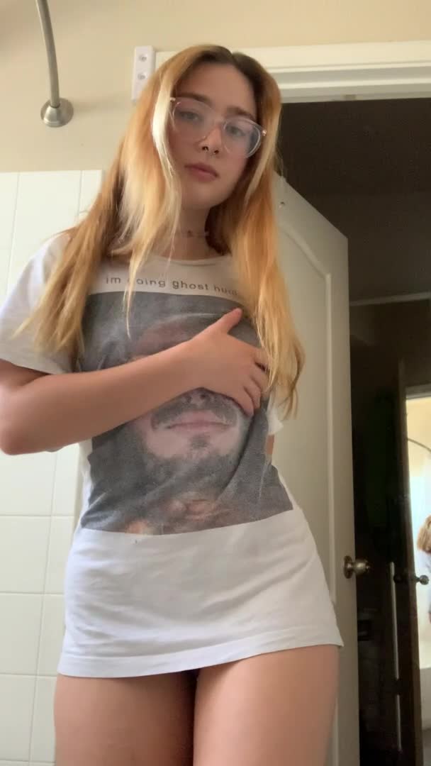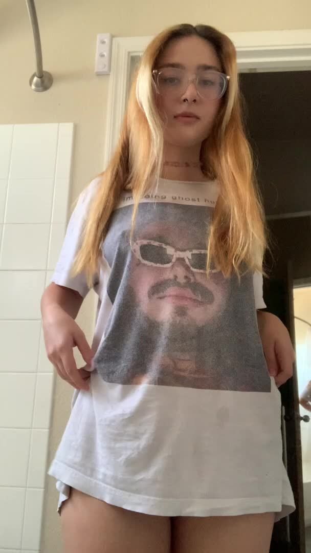 Всё красиво и очень привлекательно под футболкой у этой девушки в очках!