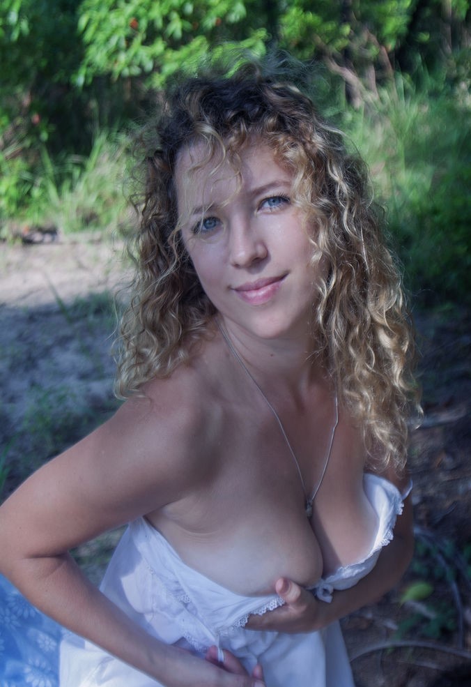 Молодая красотка с кудрявыми светлыми волосами раздевается на дереве во время сольного экшена