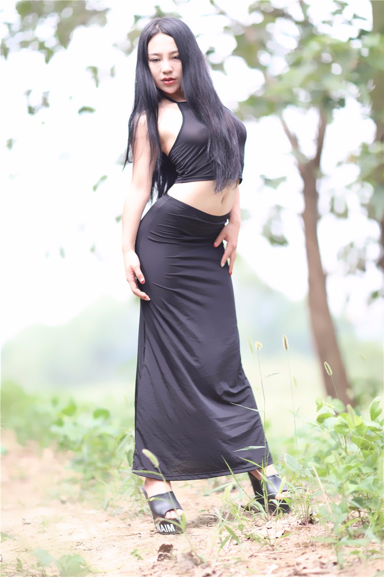 Китаяская модель красиво позирует в черном прозрачном платье.