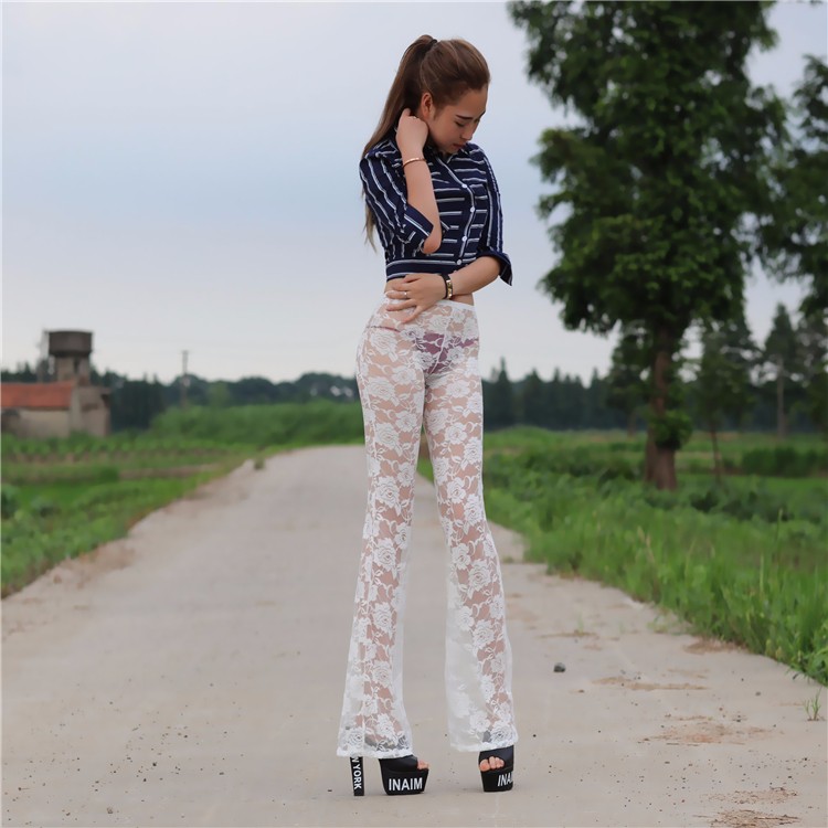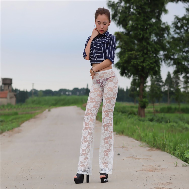 Красивая длинноногая модель с Китая шикарно позирует в прозрачных ажурных штанах.
