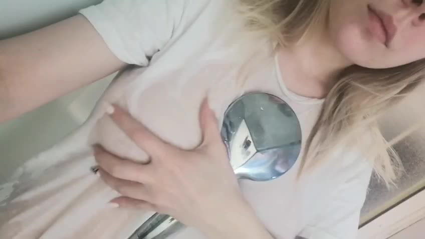 Сисястая молоденькая блондиночка просто очаровательно выглядит в мокрой белой маечке под душем!
