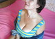 Приятная женщина кокетливо снимает маечку и показывает большую грудь.