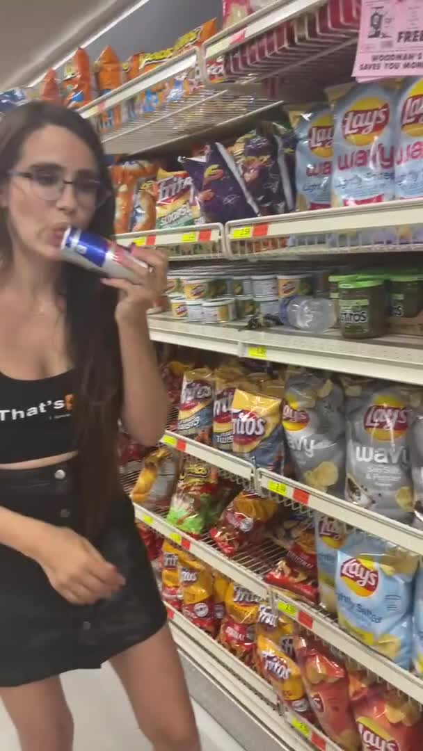 девушка в магазине засовывает баночку кока колы прямо себе в пизду