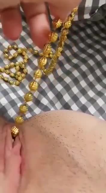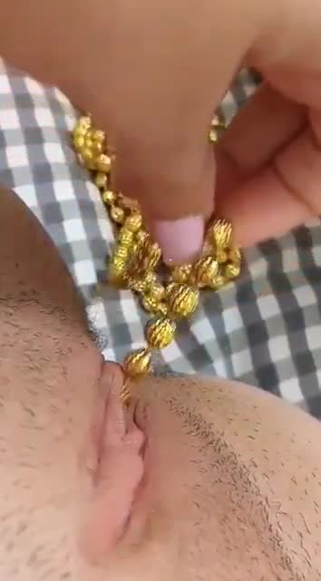 Деваха проверяет вместительность своей пизденки и спрятала в неё свои любимые бесконечные бусики