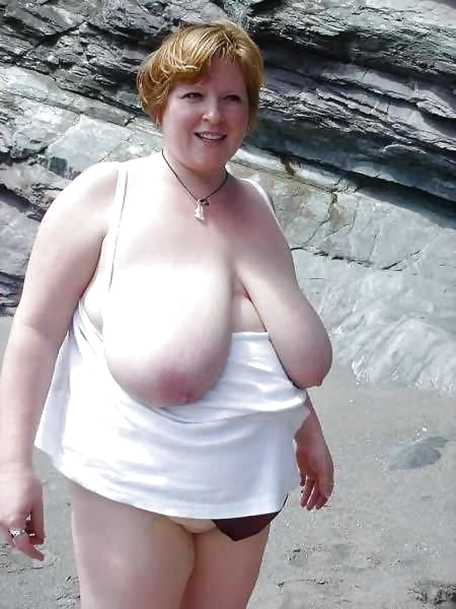 Очень толстая зрелая женщина с огромным животом и болтающимися сиськами проводит время на пляже