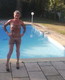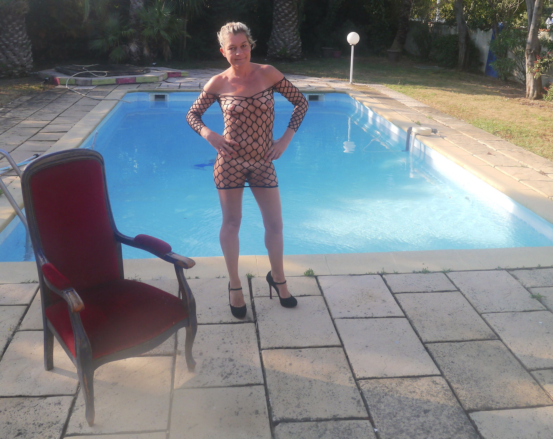 Загорелая дама в соблазнительном наряде прогуливается у бассейна
