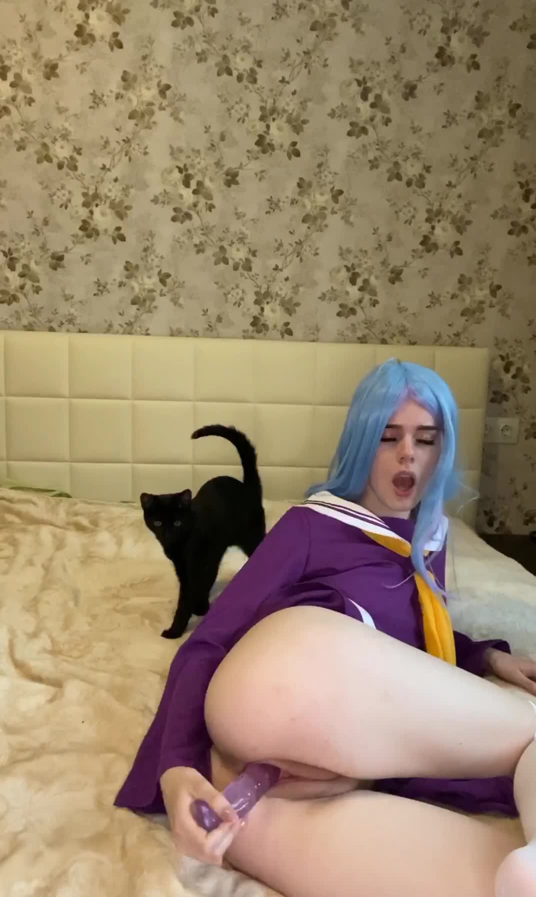 Девушка в костюме какого-то персонажа из анимэ подрачивает свою киску