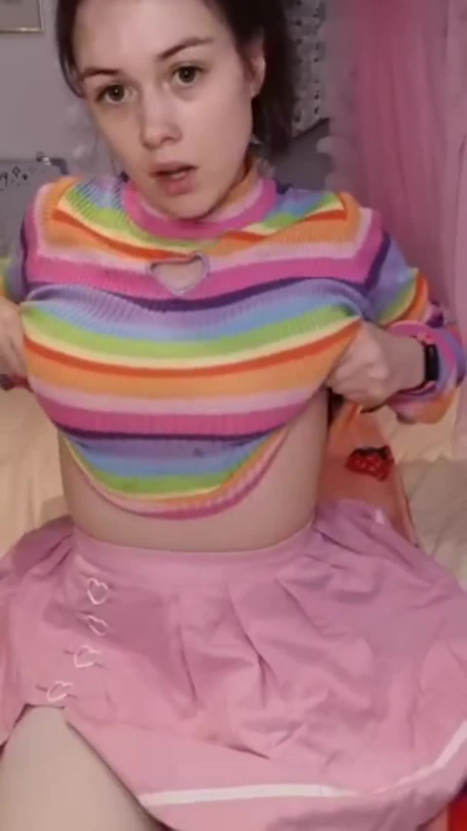 Девушка на камеру показывает свою пышную грудь и дырочки