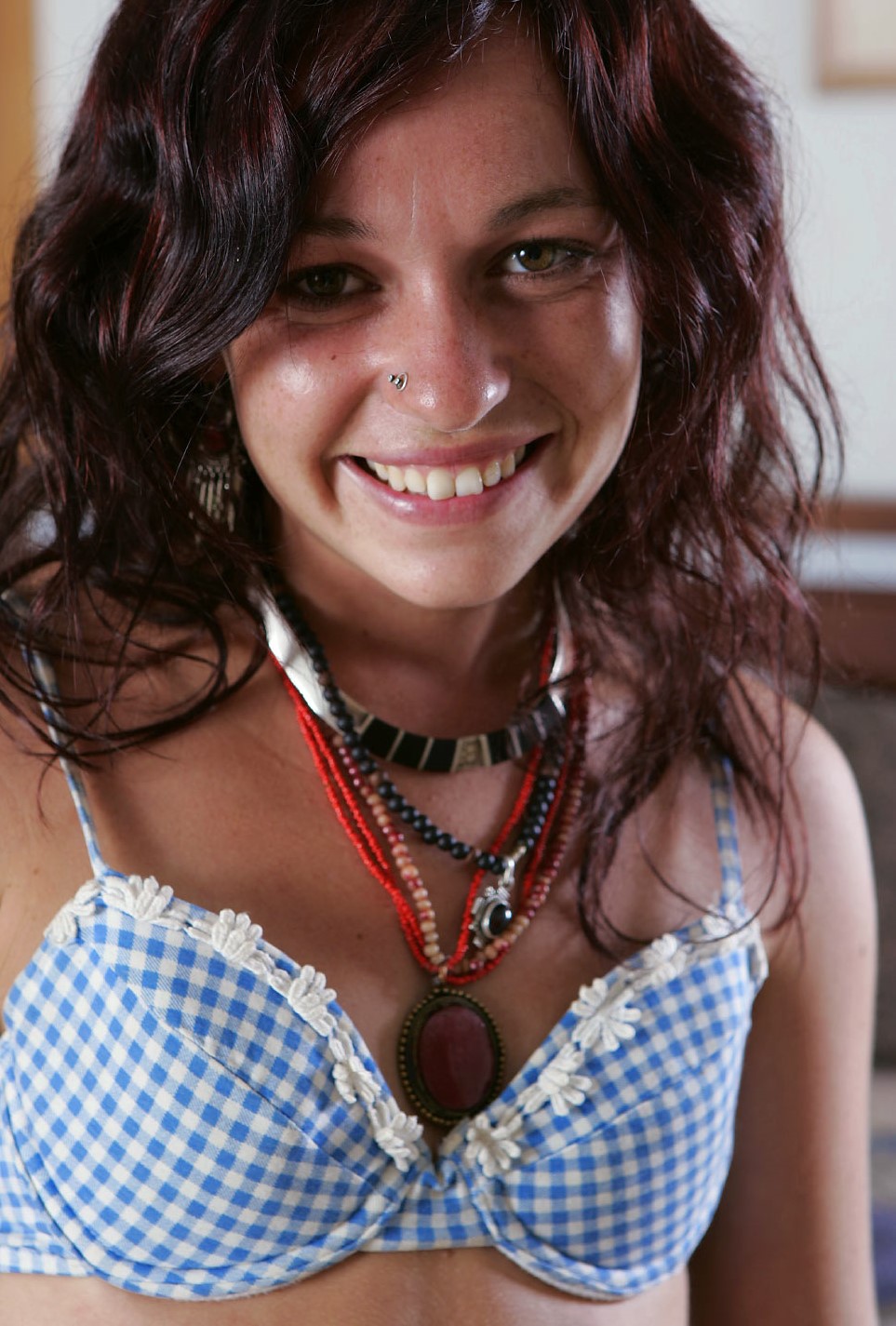 Стройная девушка показывает свою плоскую грудь.