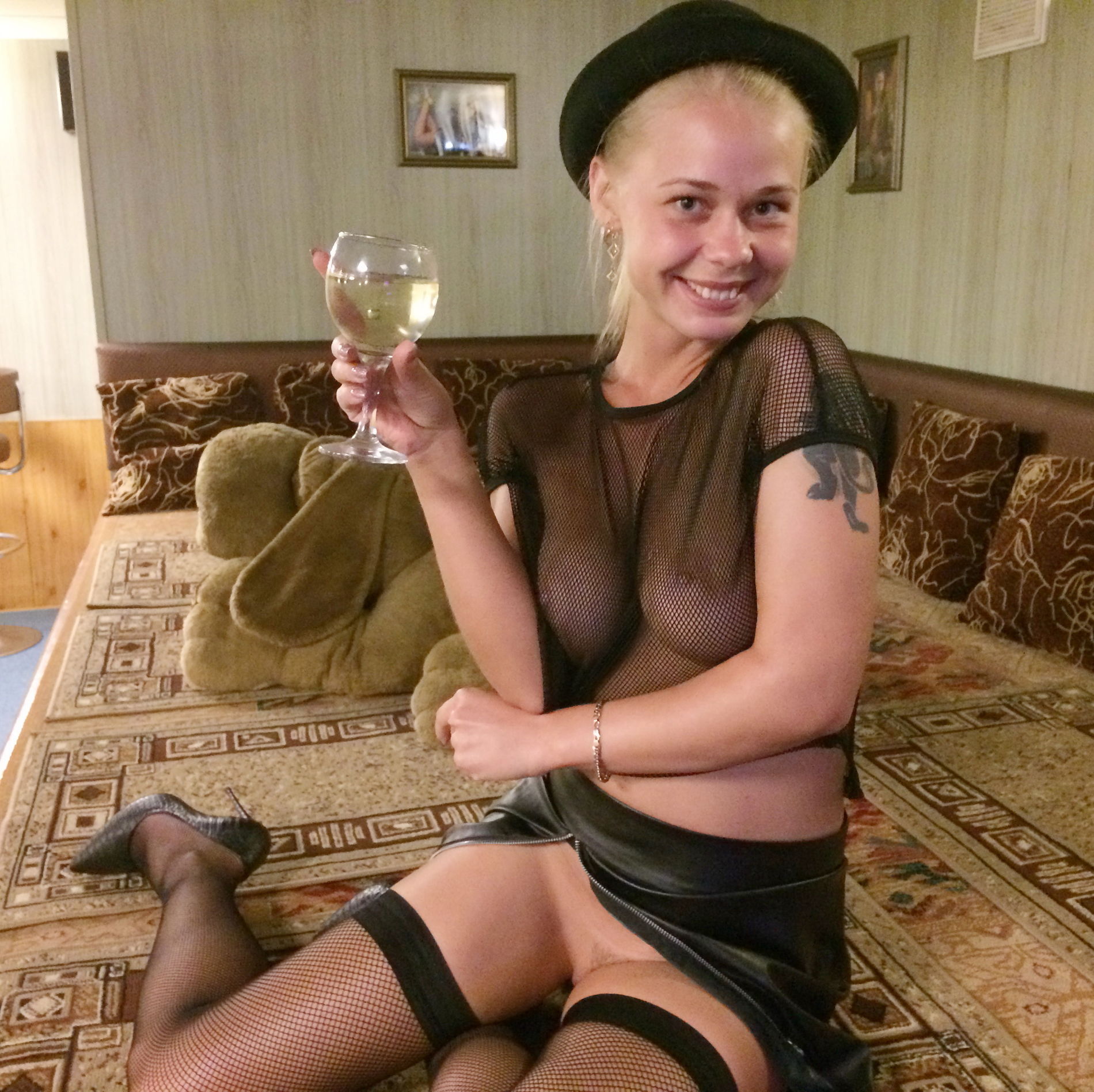 Девонька наслаждается вином и процессом съемки