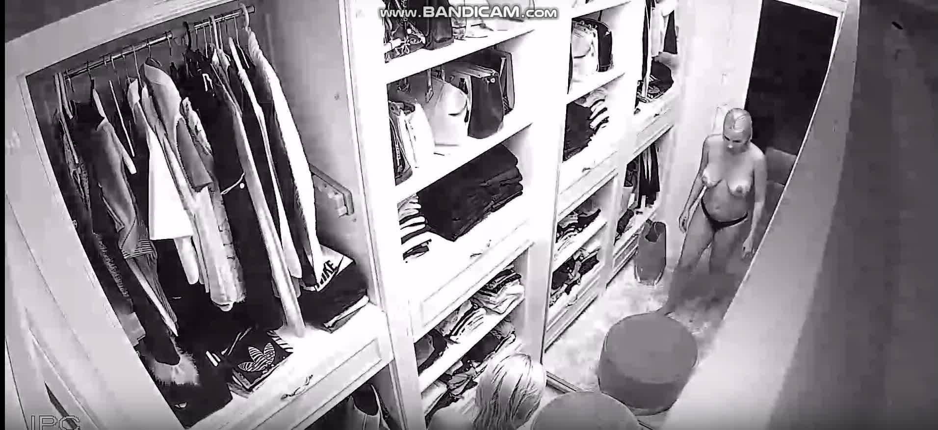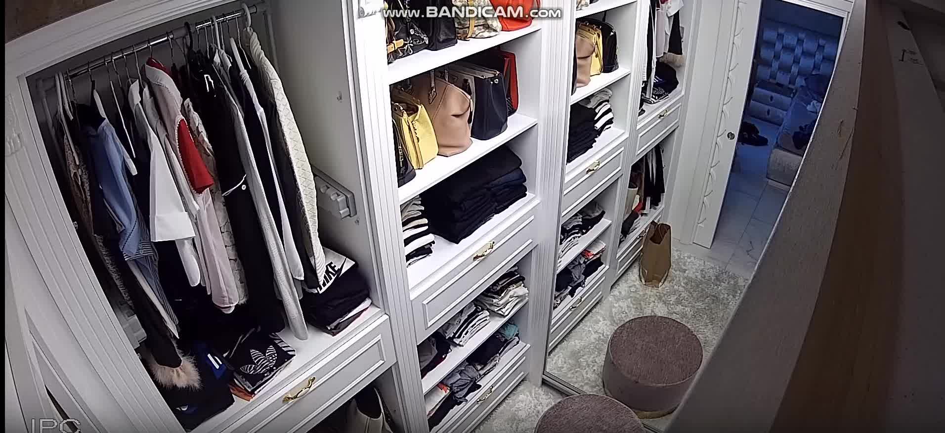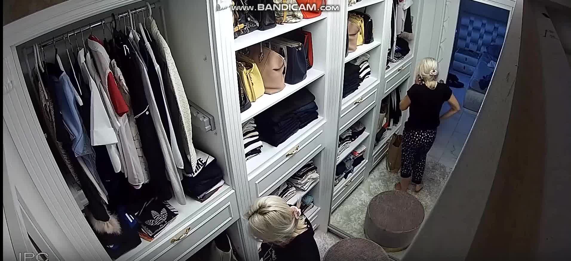 Одна молодая мадам с шикарной фигурой зашла в свою огромную комнату-шкаф для того, чтобы переоблачиться и померить какие-то новые вещи. Шкаф конечно впечатляет, все очень аккуратно сложено.