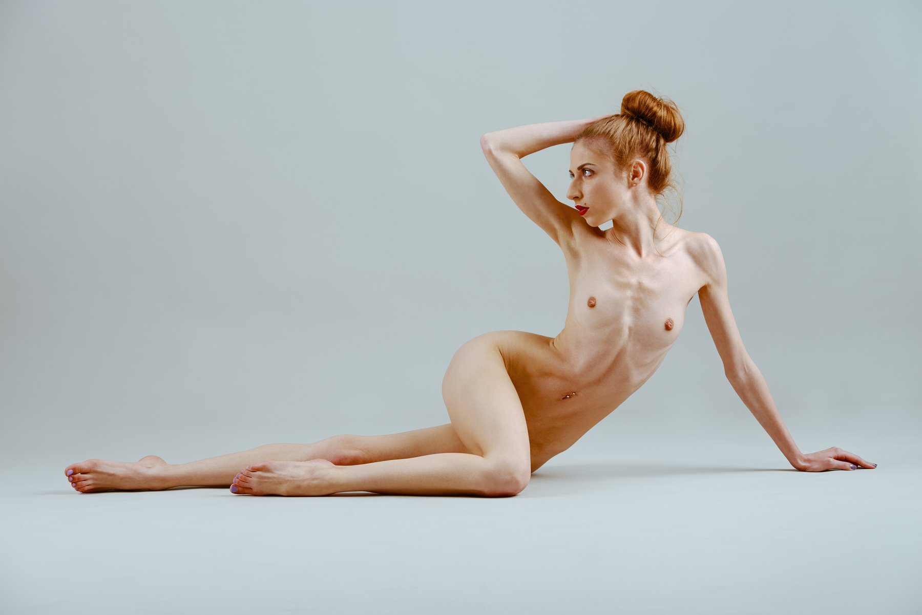 Худенькая рыжеволосая девочка с маленькой грудью и упругой попочкой позирует в студии.