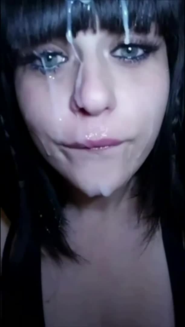 Брюнетка получает струю спермы в лиц