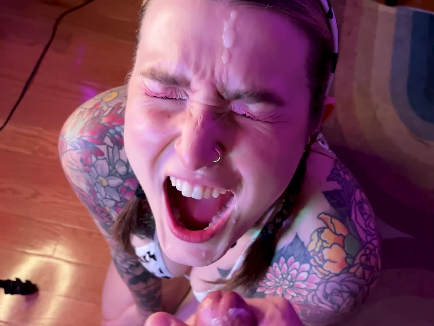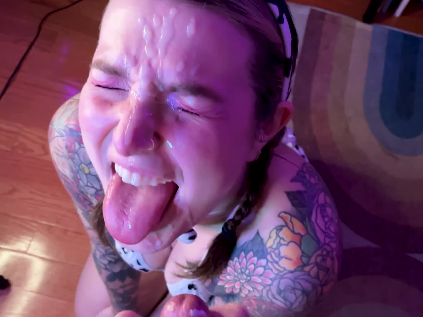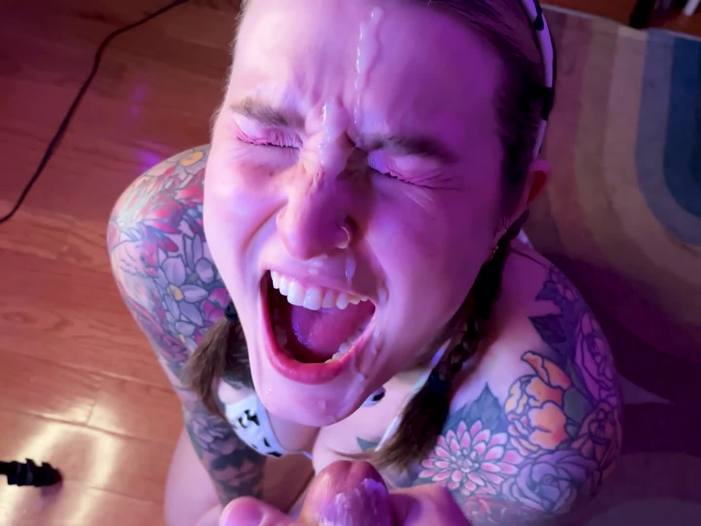 Муж кончил на лицо своей жене к её большому удовольствию и радости.