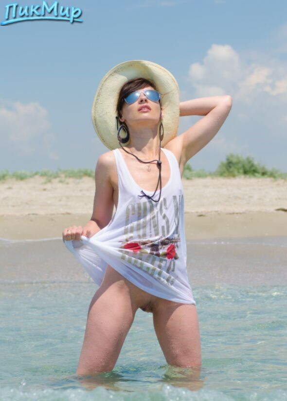 Милашка прогулялась по пляжу в футболочке, но было очень жарко и она решила искупаться, но лучше все таки голышом и люди посмотрят и загар ляжет ровнее на тело.
