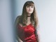 Девушка с зелёным цветом глаз сняла с себя красное платье обножив свою большую грудь.
