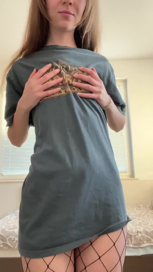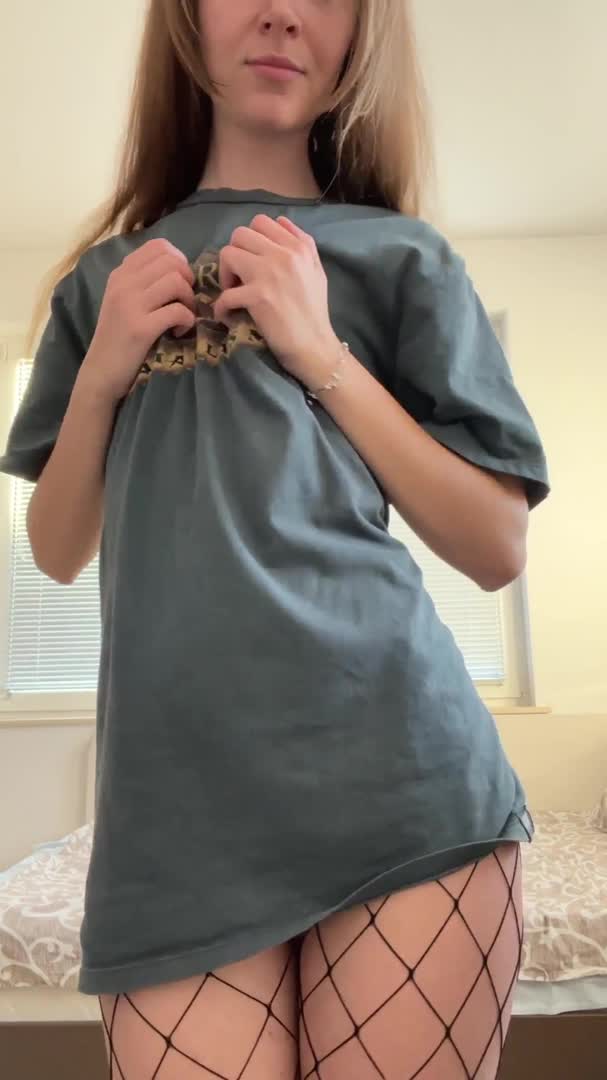 Привлекательна стройняшка одетая только в сетчатые колготочки и футболочку!