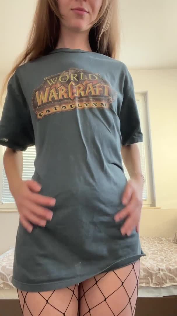 красивая девушка в колготках в сеточку без трусиков и в одной футболочке