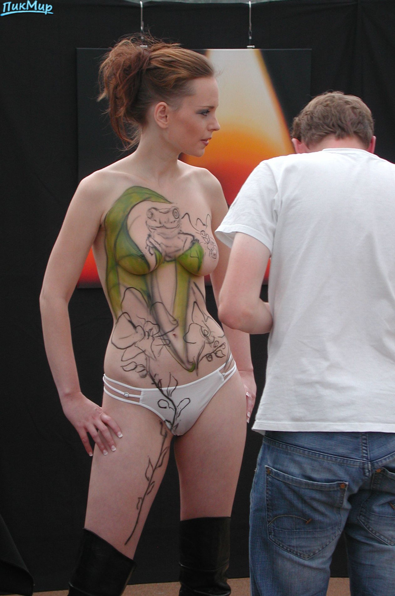 Блондинка из Саксонии любит, когда ее торс украшают аэрографом на выставке в Лейпциге, Германия. Мотив - лягушка.