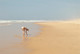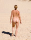 Счастливая голая девушка бегает и играет на пляже.