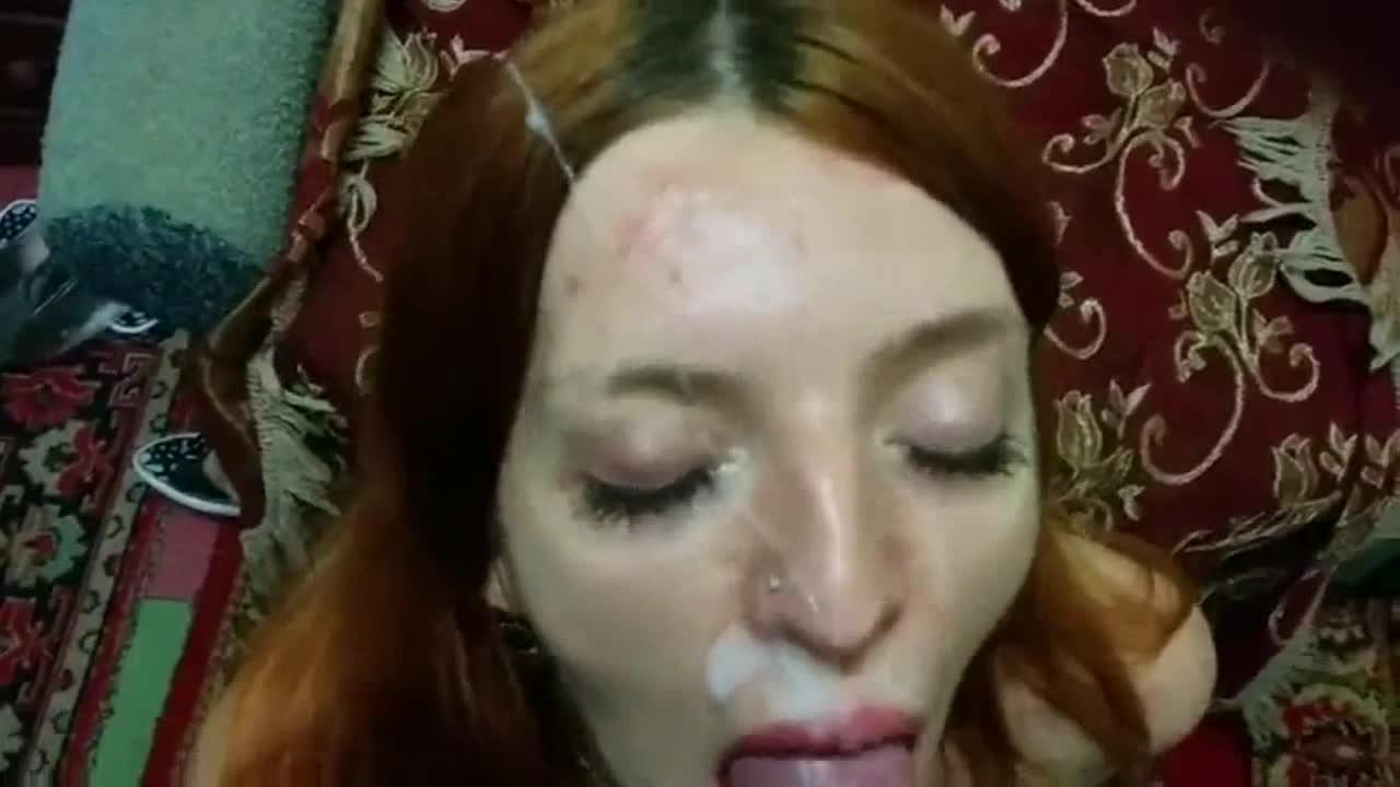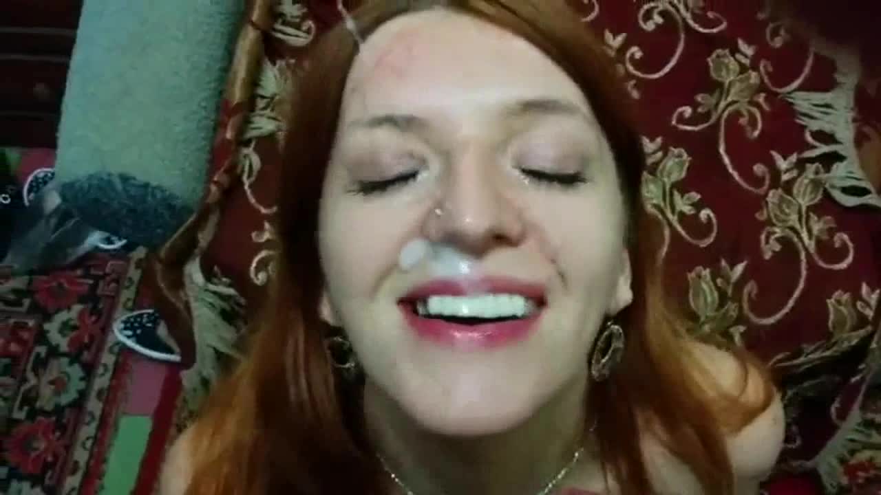 В домашней обстановке рыжая дама приняла сперму на лицо