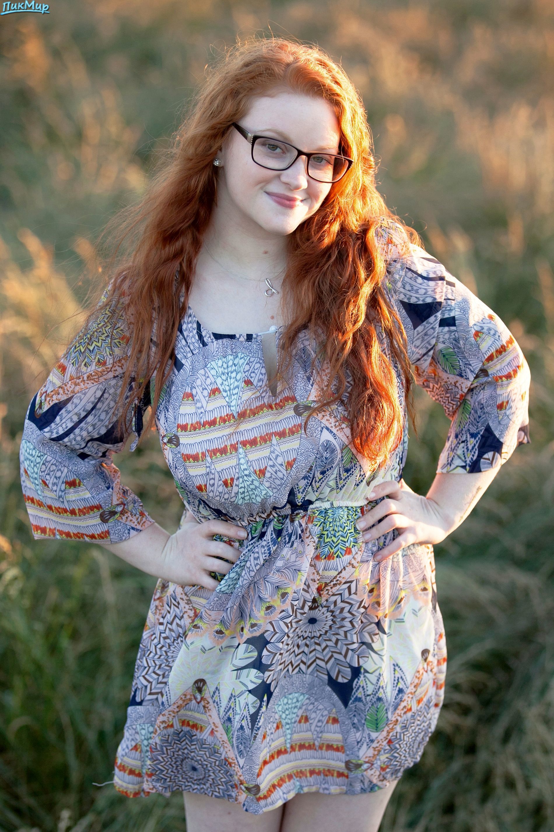 Рыжая толстушка с бритой киской и красивыми татуировками позирует обнаженной в поле.