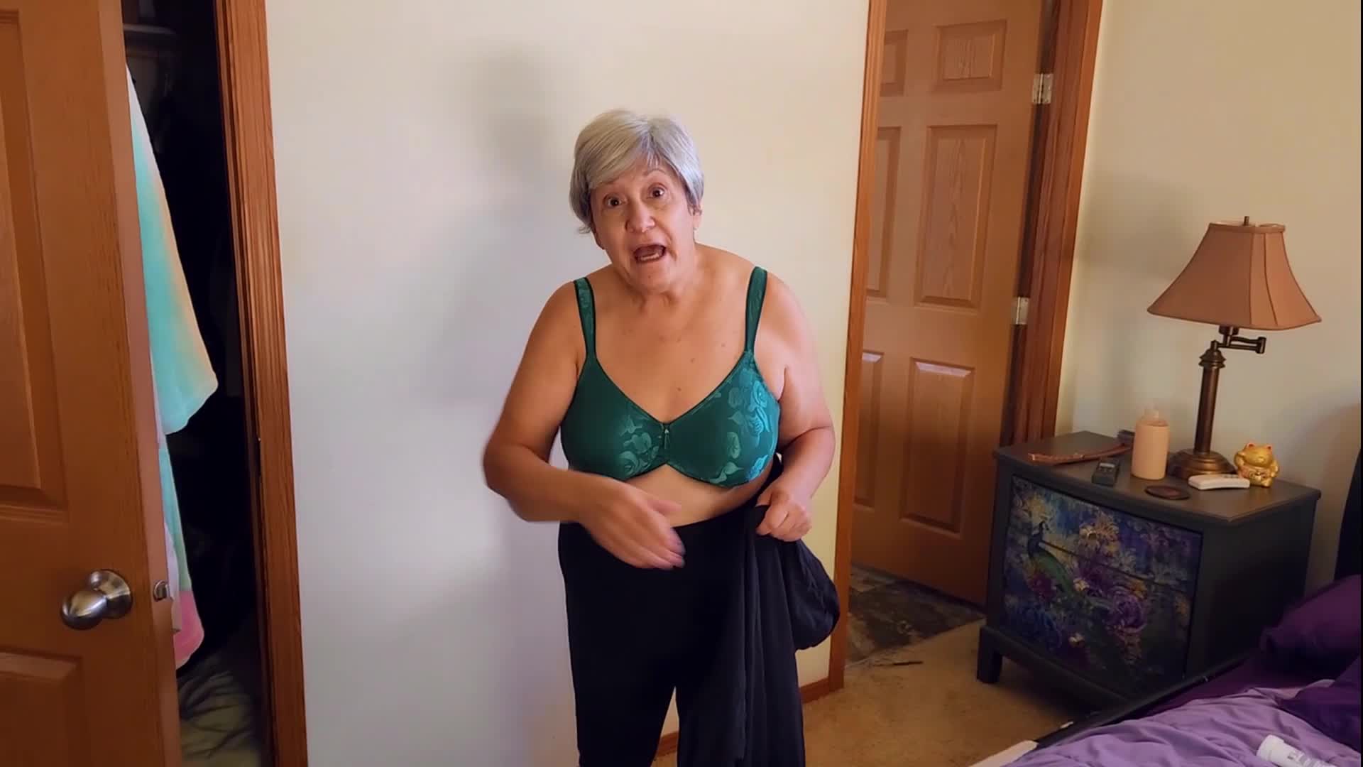 Тучная старая седая дама медленно одевается, но сначала ей пришлось почесать спину