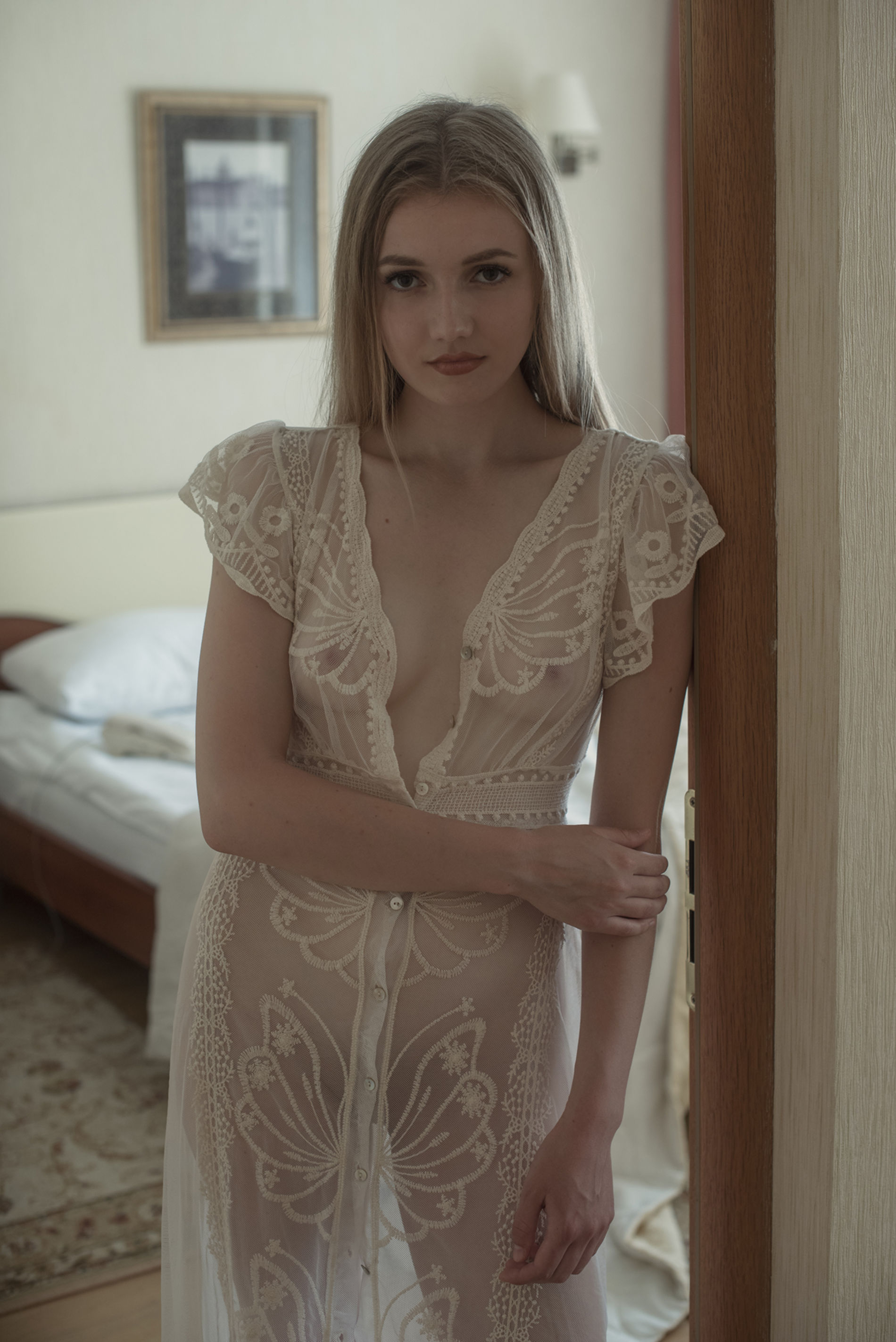 Совсем юная девочка, надеюсь, совершеннолетняя) позирует в номере отеля