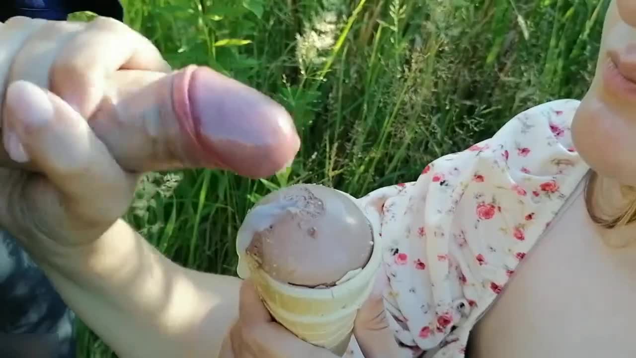 Парень угостил свою сяситую девушку, кончив на её мороженое.