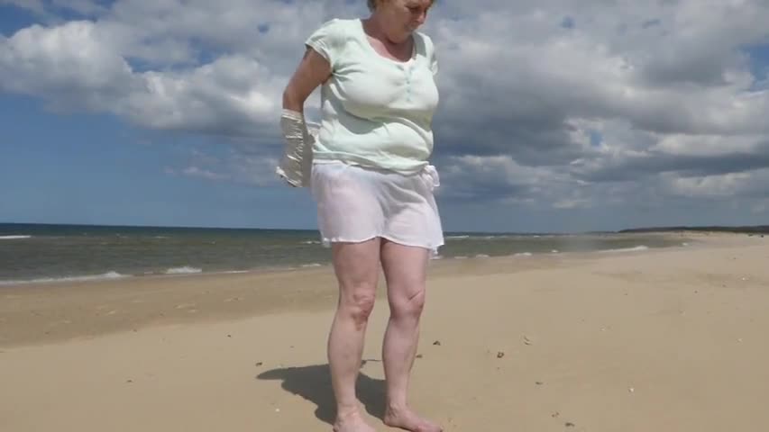 Бабушка раздевается на пляже