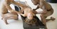 Два крепких африканца с большими членами массируют худенькую блондинку с бритой киской, потом она массирует оба их члена и делает им минет, а они кончают на нее и размазывают сперму по всему телу.