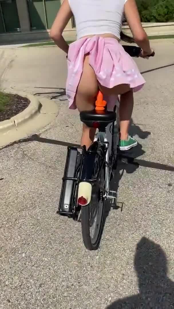 Девушка едет на велосипеде и трахает себя одновременно