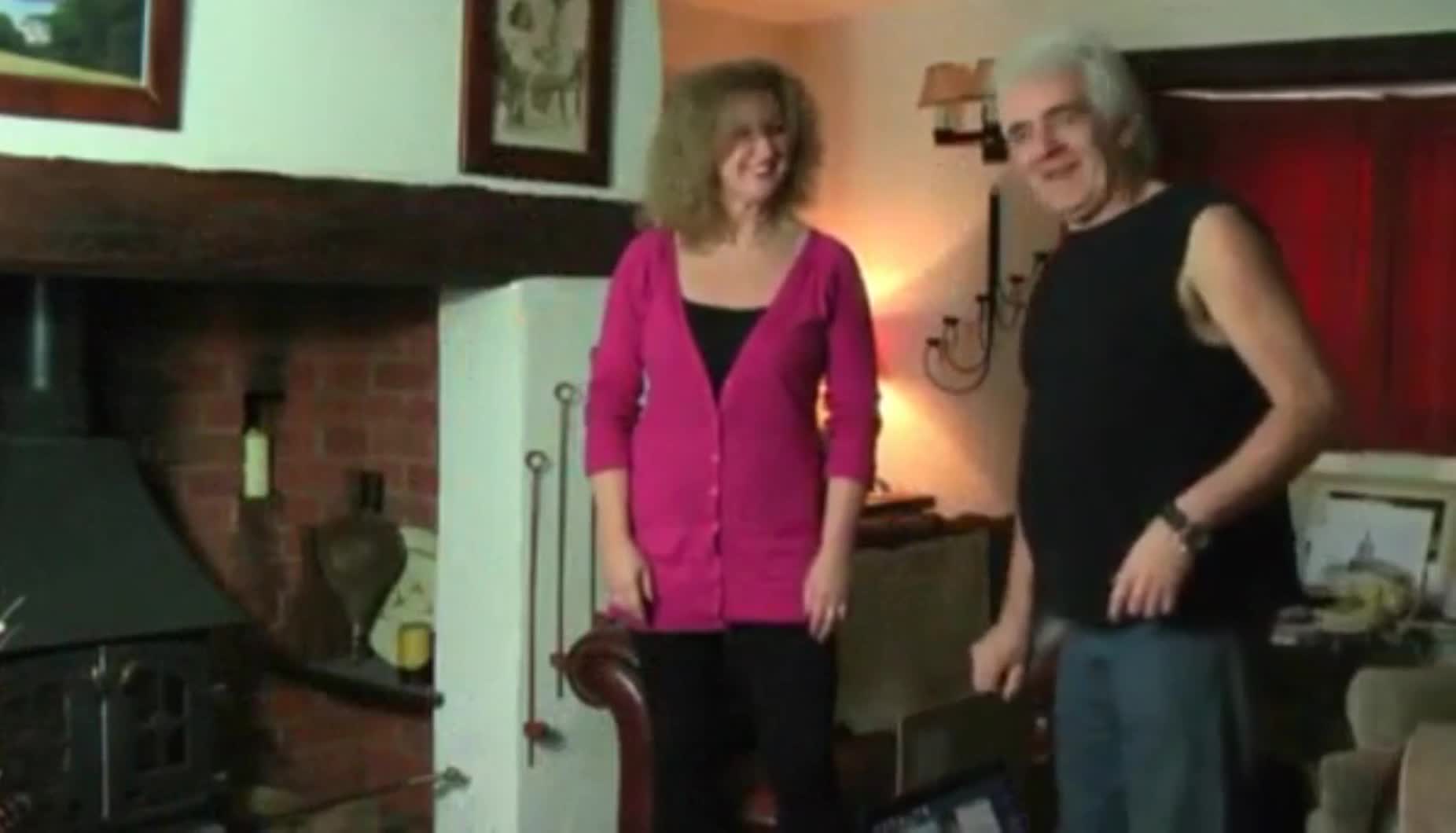 смешное видео мужчины, демонстрирующего волшебный рамку, с котором сквозь одежду видно обнаженное тело его жены.