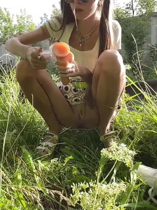 худенькая девушка без трусов гуляет по улице, мастурбируя и трахая свою киску в прямом эфире