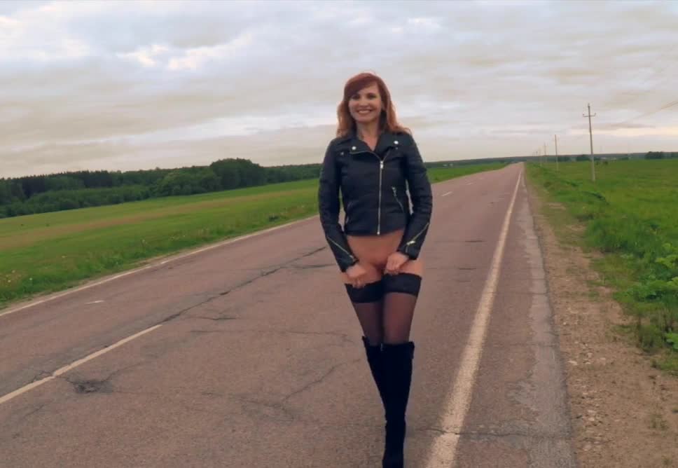 Рыжеволосая Евгения решила показать красивый стриптиз прямо на трассе.