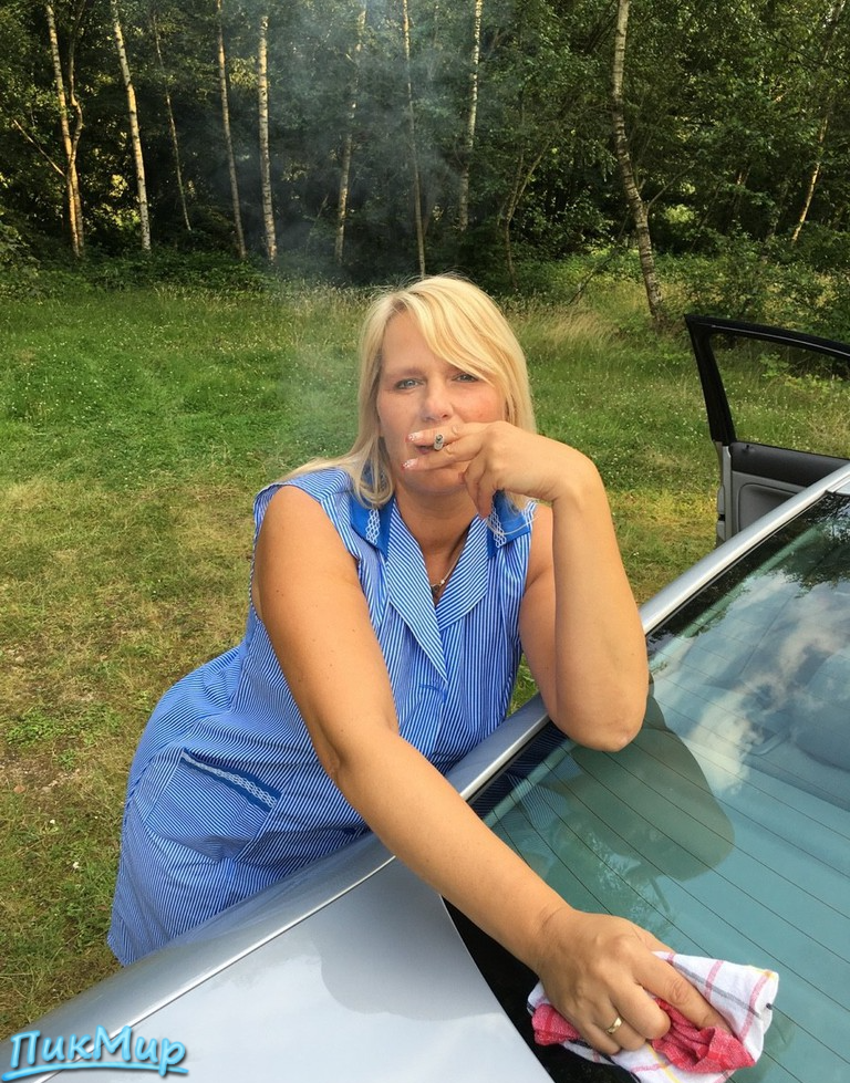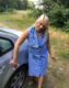 Женщина на природе показывает стриптиз возле машины с сигаретой