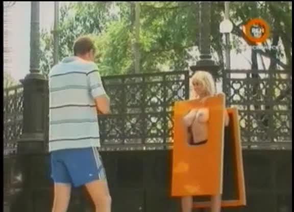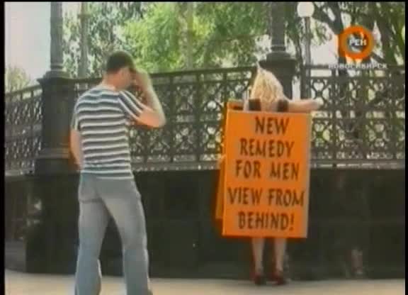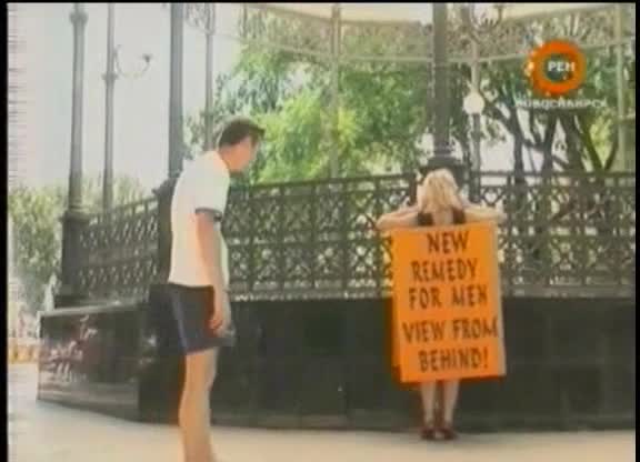 серия «голый и смешные», в которой блондинка несет табличку с надписью"новое средство для мужчин, вид сзади",а когда она оборачивается, к радости прохожих видны ее большие сиськи.