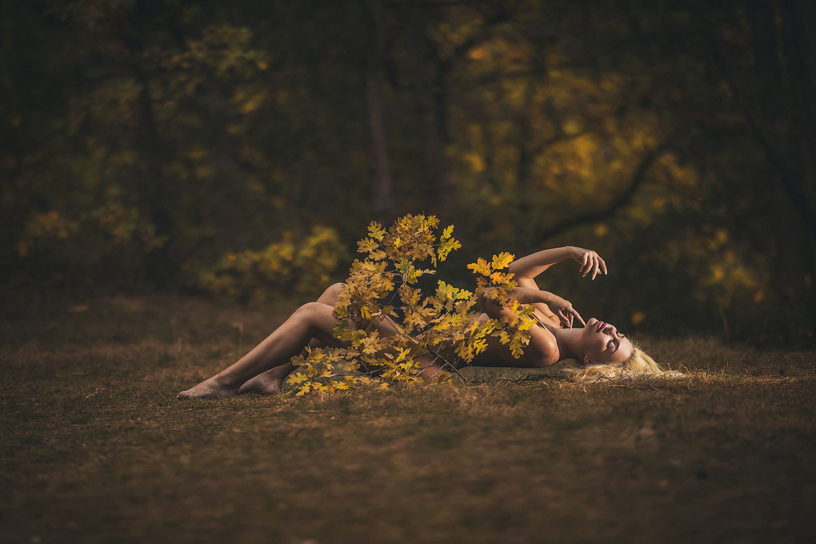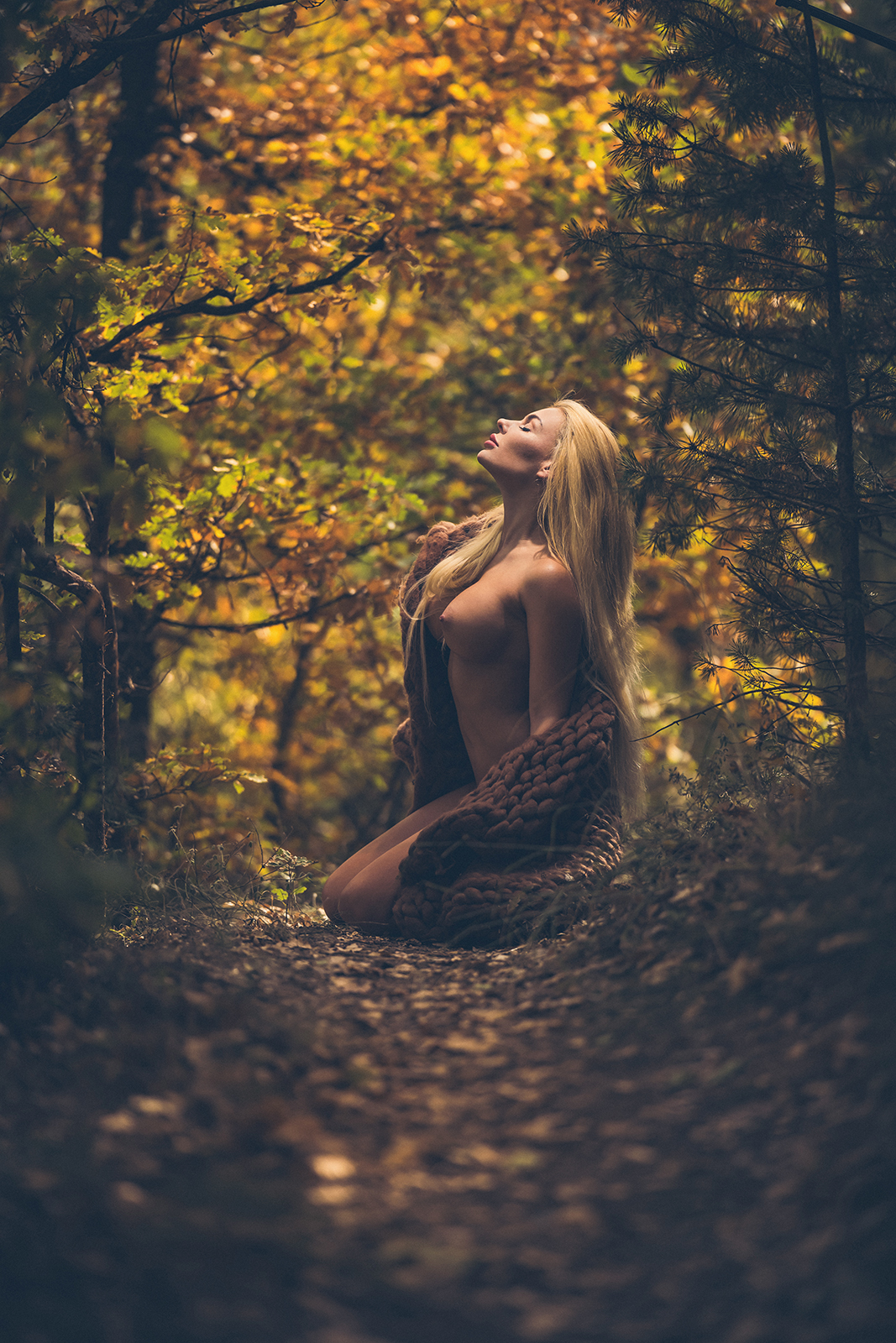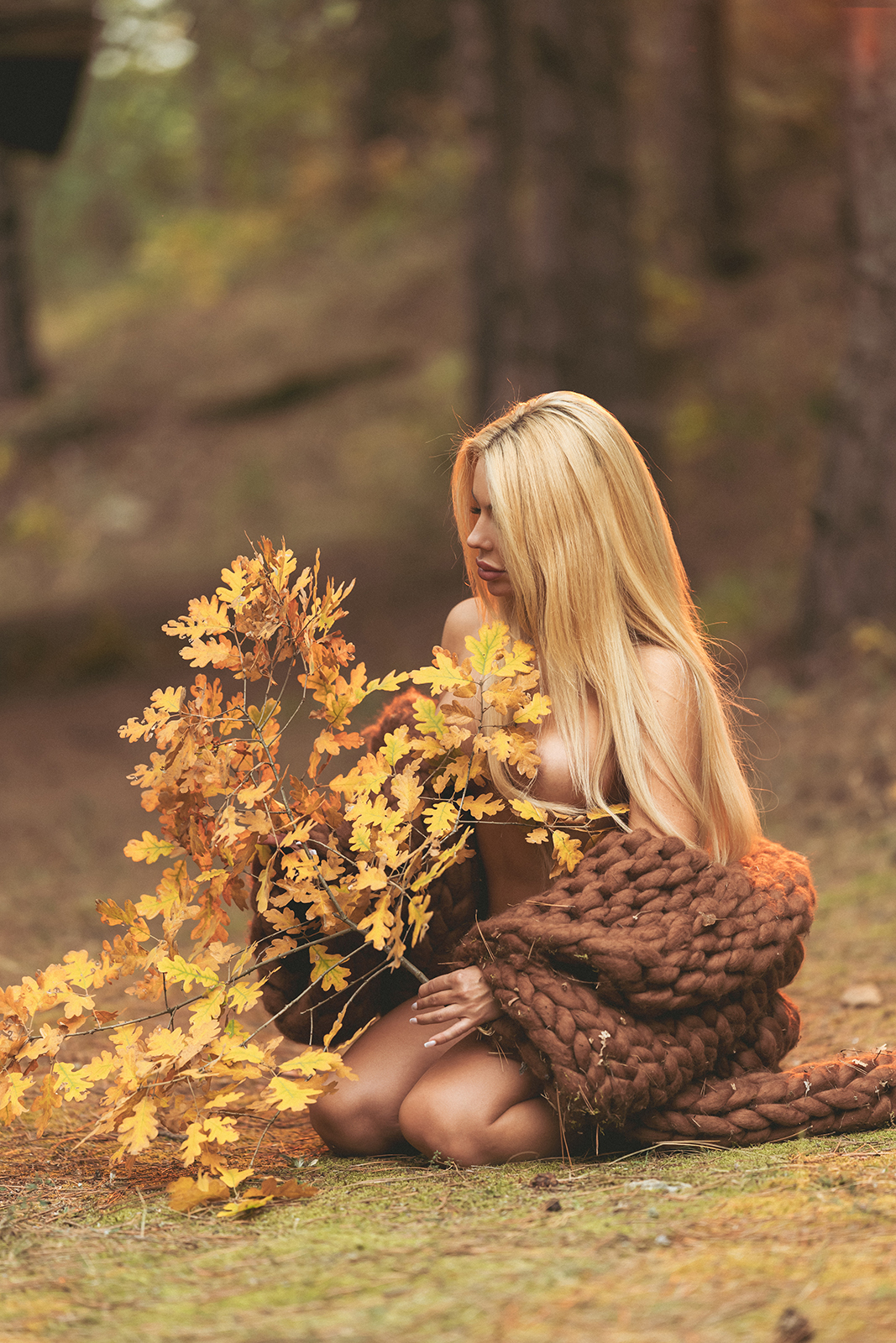 Весьма привлекательная блондинка, немного доработанная специалистами, охотно позирует в лесу