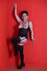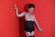 Красиво смотрится на красном фоне дама в черном белье.
