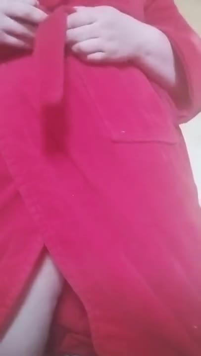 Сдобная дамочка в красном халате представляет свои прелести