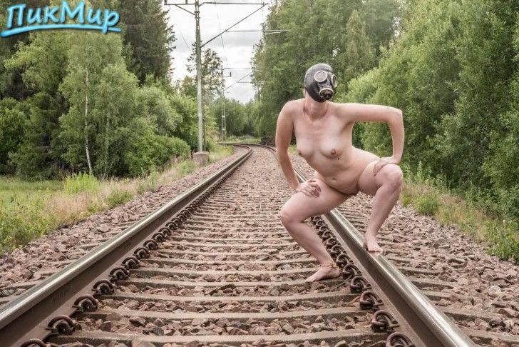 Девушка с большой жопой, маленькой грудью и бритой киской с противогазом на лице позирует полностью обнаженной на железнодорожных рельс в разных позах.