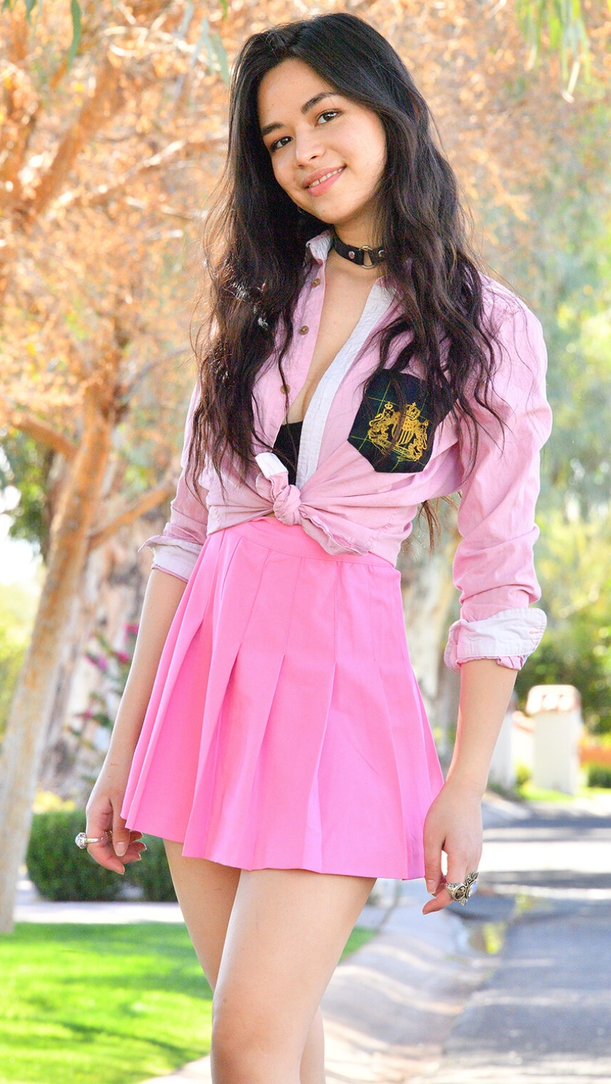 Озорная брюнетка гуляет по парку