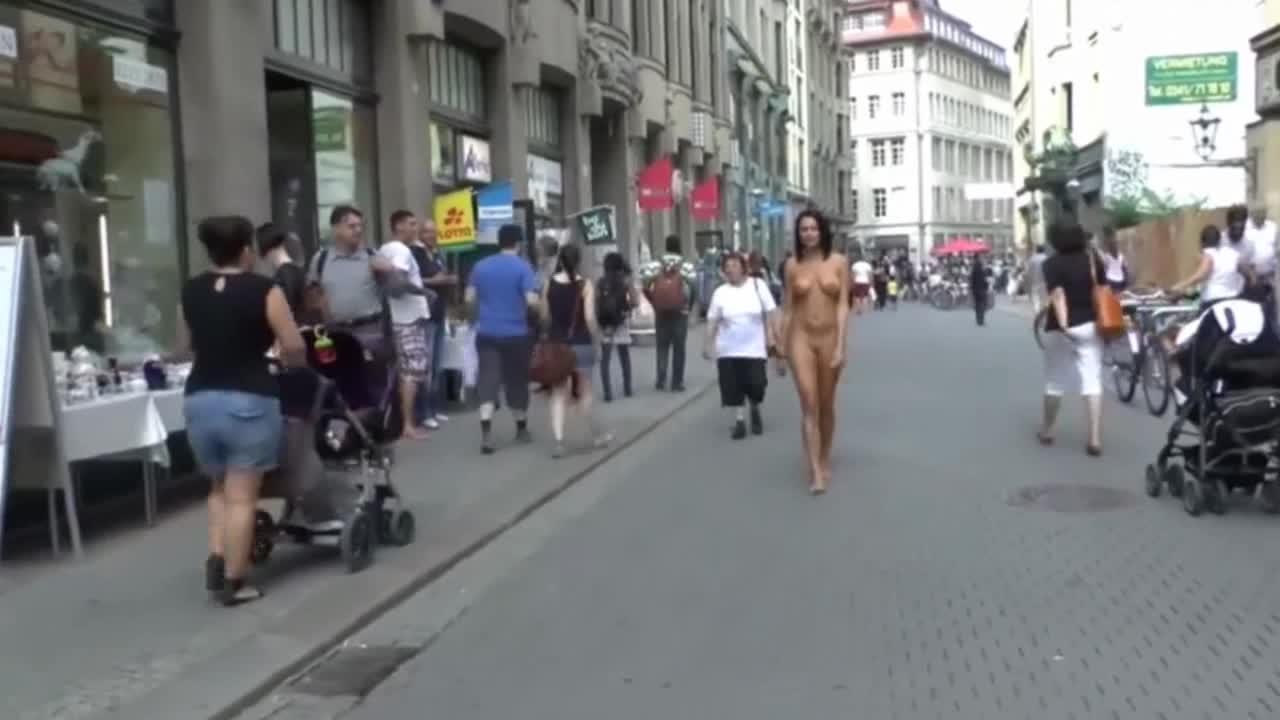Прекрасная стройная девушка ходит абсолютно голая по улицам на которых полно народу. Чаще бы такие так ходили.