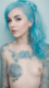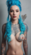 На картинках изображены девушки с синими волосами и татуировками, позирующие в белом бикини. Их уникальный стиль и внешность притягивают внимание благодаря контрасту белого бикини и её ярких волос, а также видимым татуировкам, подчеркивающие их неповторимый образ.