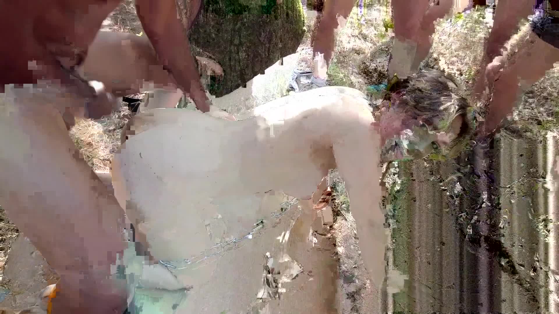 в каком-то лесу куча мужиков её немного потрахали обкончали ей лицо